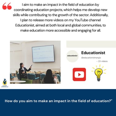 I aim to make an impact in the field of education by coordinating education projects, which helps me develop new skills while contributing to the growth of the sector. Additionally, I plan to release more videos on my YouTube channel Educationist, aimed at both local and global communities, to make education more accessible and engaging for all.