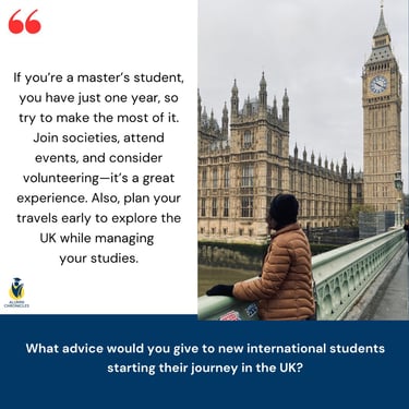 starting their journey in the UK? If you’re a master’s student, you have just one year, so try to make the most of it. Join societies, attend events, and consider volunteering—it’s a great experience. Also, plan your travels early to explore the UK while managing your studies.
