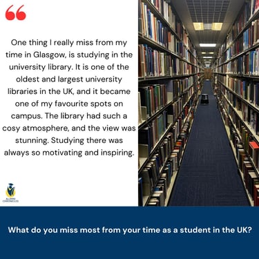 One thing I really miss from my time in Glasgow, is studying in the university library. It is one of the oldest and largest university libraries in the UK, and it became one of my favourite spots on campus. The library had such a cosy atmosphere, and the view was stunning. Studying there was always so motivating and inspiring.
