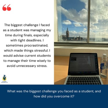 The biggest challenge I faced as a student was managing my time during finals, especially with tight deadlines. I sometimes procrastinated, which made things stressful. I would advise current students to manage their time wisely to avoid unnecessary stress.